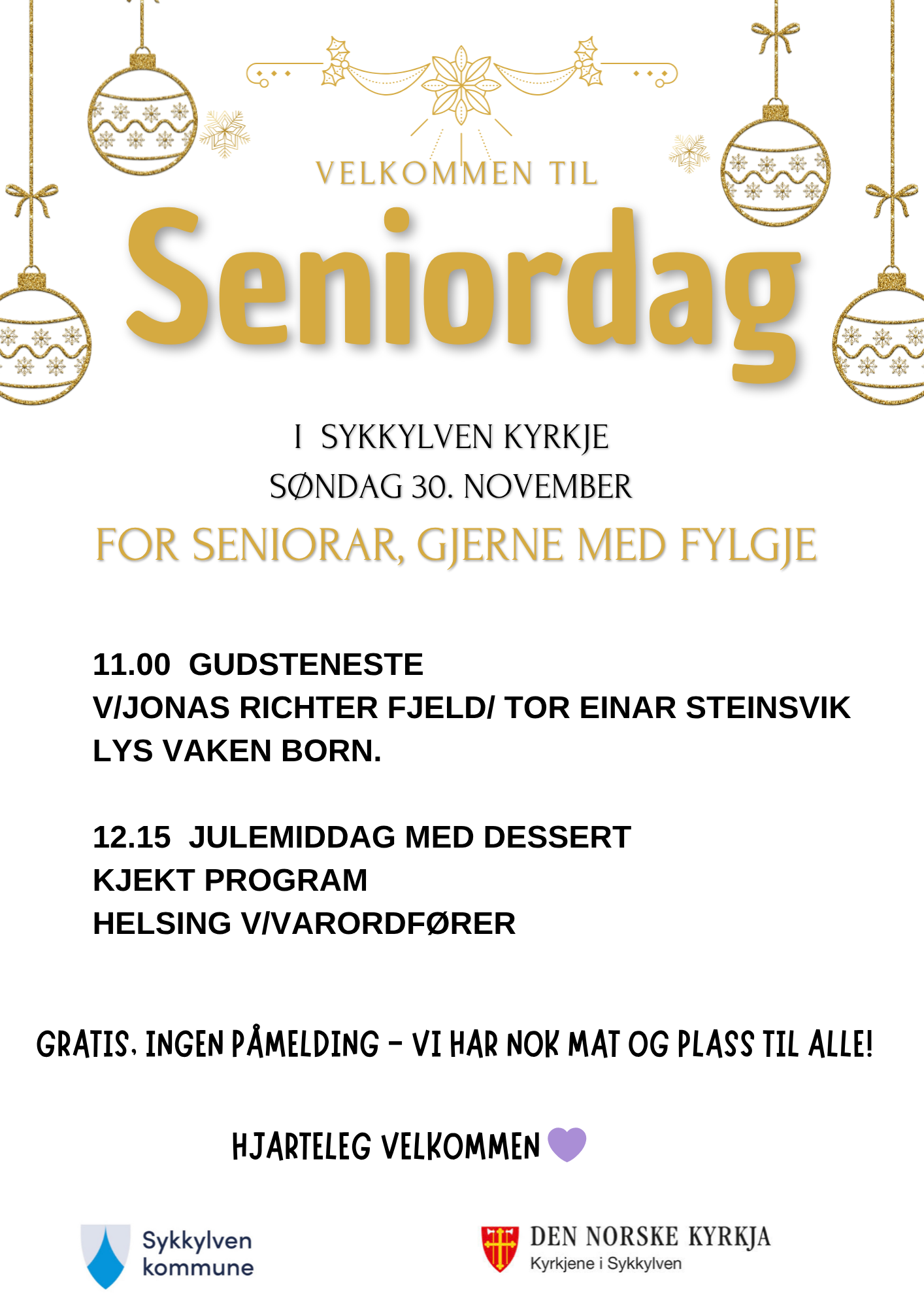 Arrangementet er for seiorar, gjerne med følge. Det er gratis, og utan påmelding. Hjarteleg velkomen! Arrangørane er kommunen og kyrkja