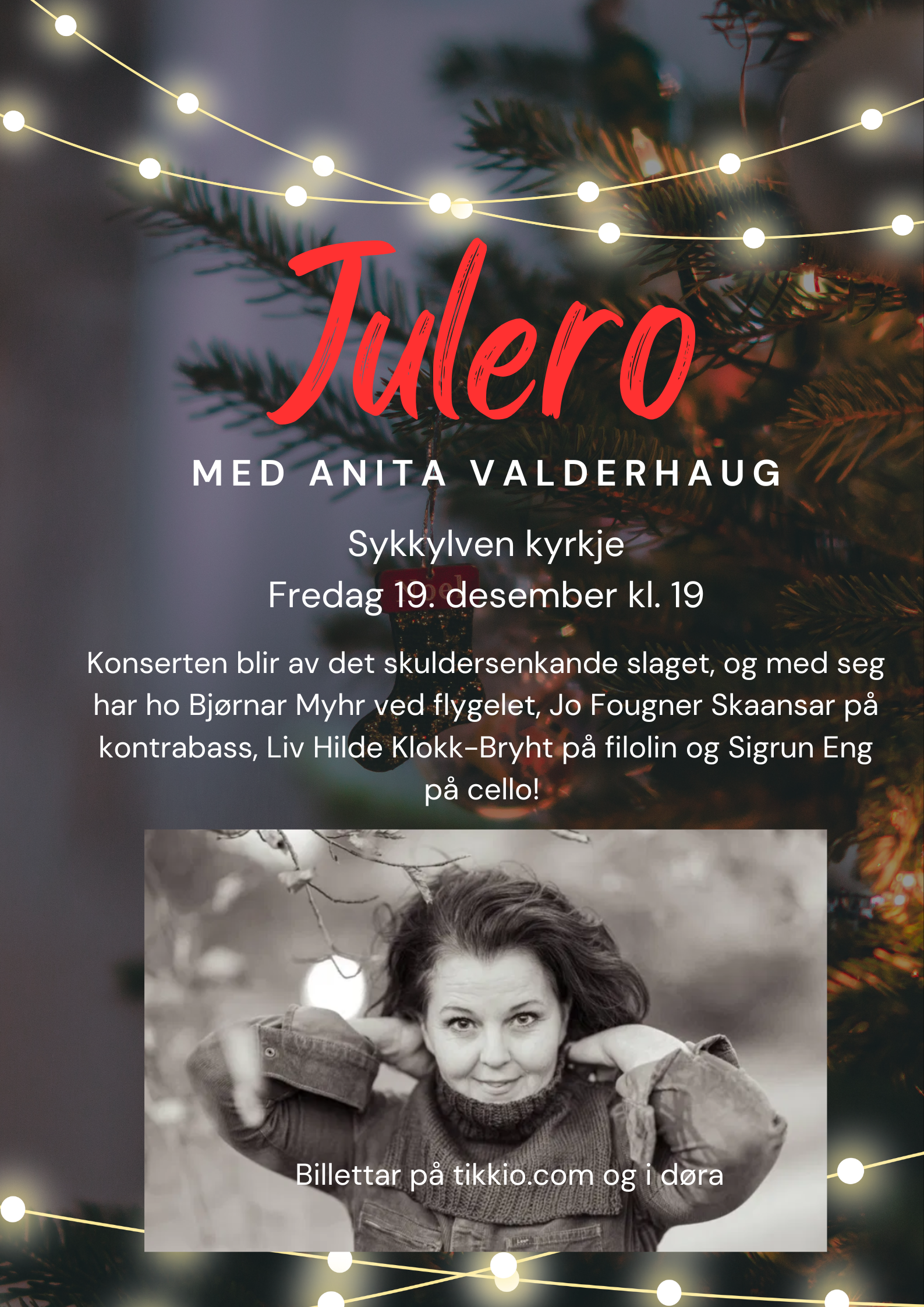 Anita Valderhaug tar med seg kremlag til Sykkylven Kyrkje denne kvelden. Konserten blir av det skuldersenkende slaget, og med seg har hun Bjørnar Myhr ved flygelet. Han arrangerer musikken for fløyelsbesetningen; Jo Fougner Skaansar på kontrabass, Liv Hilde Klokk-Bryht på filolin og Sigrun Eng på cello! Liv Hilde er en av Ålesunds store musikalske stoltheter som mellom annet spiller i Oslo Stykekvartett og Kammerorkesteret.