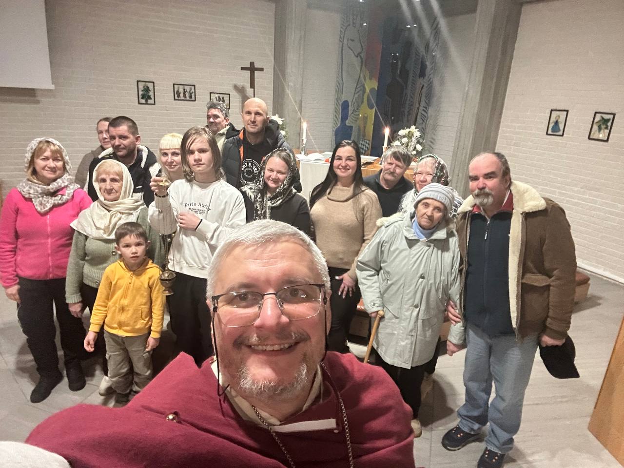 Det samla seg 19 personar til gudstenesta – noko som vart ei gledeleg og rørande overrasking for oss. Gudstenesta vart feira i ei stemning prega av glede, varme og julevon. Under gudstenesta vart det sunge ukrainske julesalmar, og det vart beden for Ukraina, for landets soldatar og for alle som lir under krigens gru.