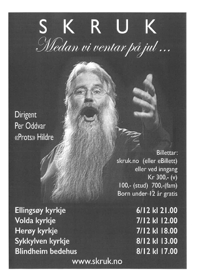 Sett av 8. desember! SKRUK inviterar då nok ein gong til konsert der vi byr på sangar frå rundtom i verda. Vi kjem til å gjere sangar frå den Arameiske kirke til amerikansk godspel og nyare låtar. På denne turnèen tar vi også med sangar frå våre juleplater. Bli med oss i ei rolig stund medan vi ventar på jul. Billett kan du bestille HER