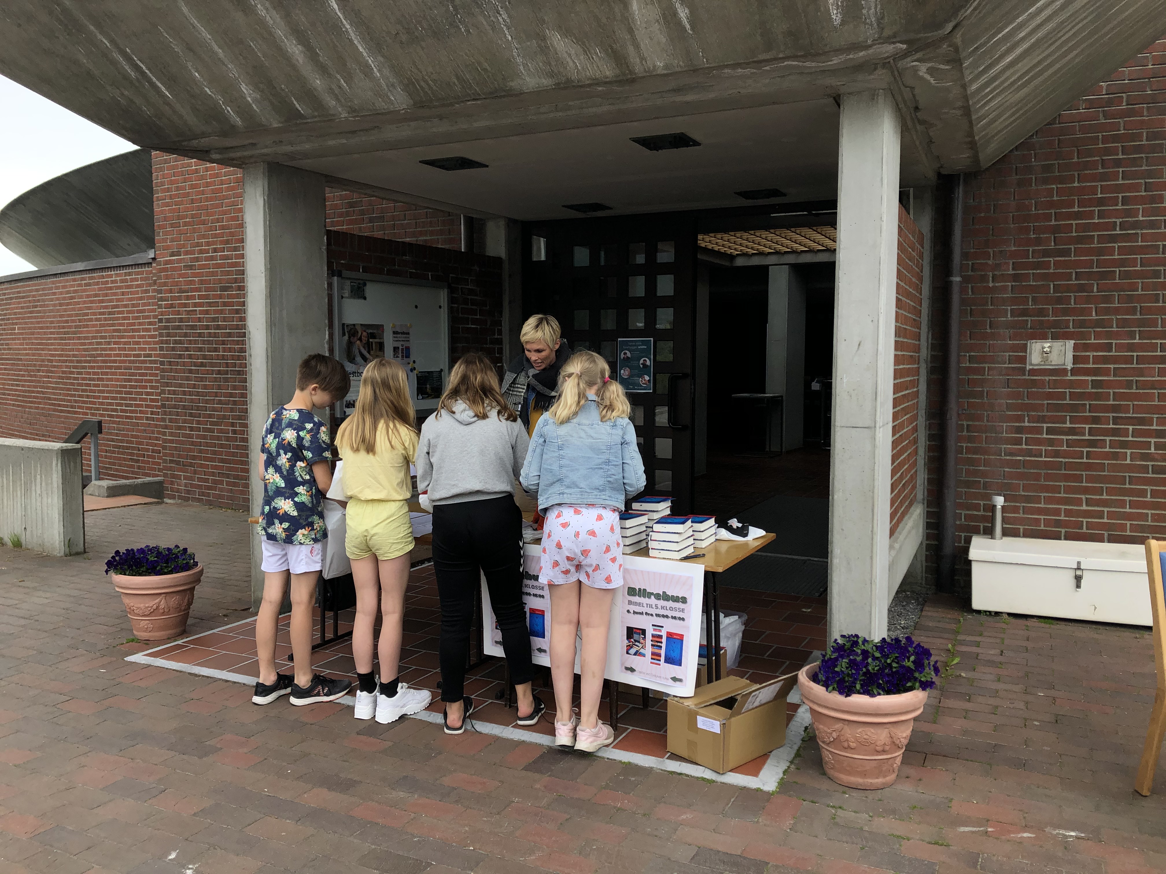 5.klassingane som var med på rebusen fekk alle sin eigen Bibel i premie, og dei blei i tillegg med på trekninga av ei hengekøye frå Ticket to the Moon. Lene vart den heldige vinnaren, og her ser de henne med hengekøya framfor seg, ilag med vennar: