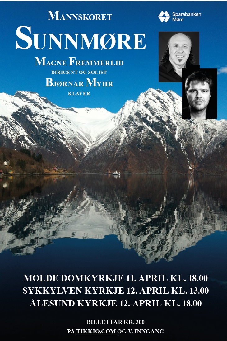 Konsert i Sykkylven kyrkje søndag 12. april kl. 13.00 ved Mannskoret Sunnmøre, Bjørnar Myhr på klaver og Magne Fremmerlid, dirigent og solist.